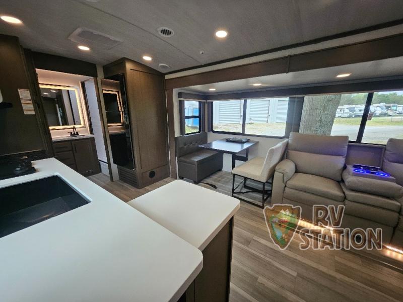 Step inside to discover a thoughtfully designed interior featuring a spacious living area with plush seating and a modern entertainment system. The kitchen is equipped with high-quality appliances, including a refrigerator, microwave, and a three-burner stove, all set within a sleek, contemporary design. The dining area comfortably seats four, making it perfect for family meals or entertaining guests. The master bedroom offers a cozy queen-sized bed, while the convertible sofa and dinette provide additional sleeping options, accommodating up to six people in total.