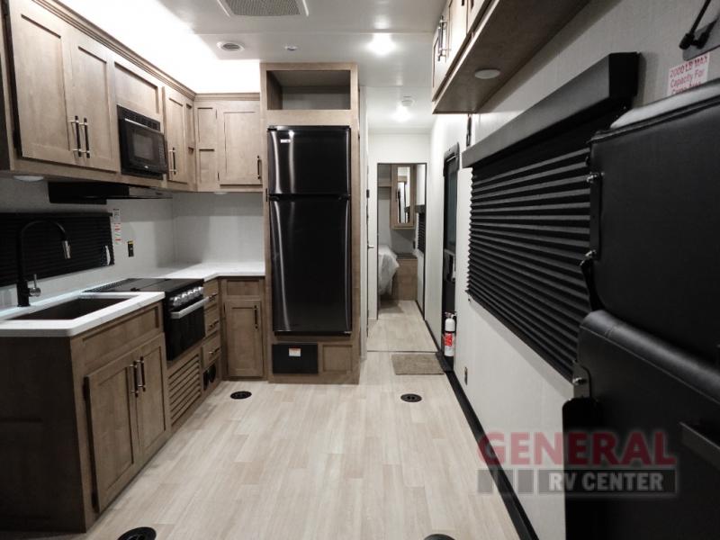 Measuring an impressive 27 feet in length, the Fuzion Impact Edition offers ample space for both living and storage. Its robust design includes a fuel capacity of 114 liters, ensuring you have the power to reach your destination and beyond. Weighing in at 3,232 kilograms, this RV is engineered for stability and ease of towing, making it a reliable partner on any adventure. The toy hauler's versatile garage space is ideal for storing your ATVs, bikes, or other gear, allowing you to bring along all the essentials for your outdoor pursuits.
