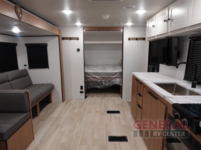 The Passport Classic 260BHC features a single slide-out that expands the living area, providing a generous space for relaxation and entertainment. Inside, you'll find a well-appointed interior with a fully equipped kitchen, including a refrigerator, microwave, and stove, making meal preparation a breeze. The sleeping arrangements are thoughtfully designed, with a queen-sized bed, double bunk beds, and convertible dinette and sofa beds, ensuring everyone has a cozy place to rest.