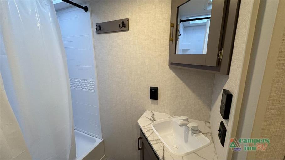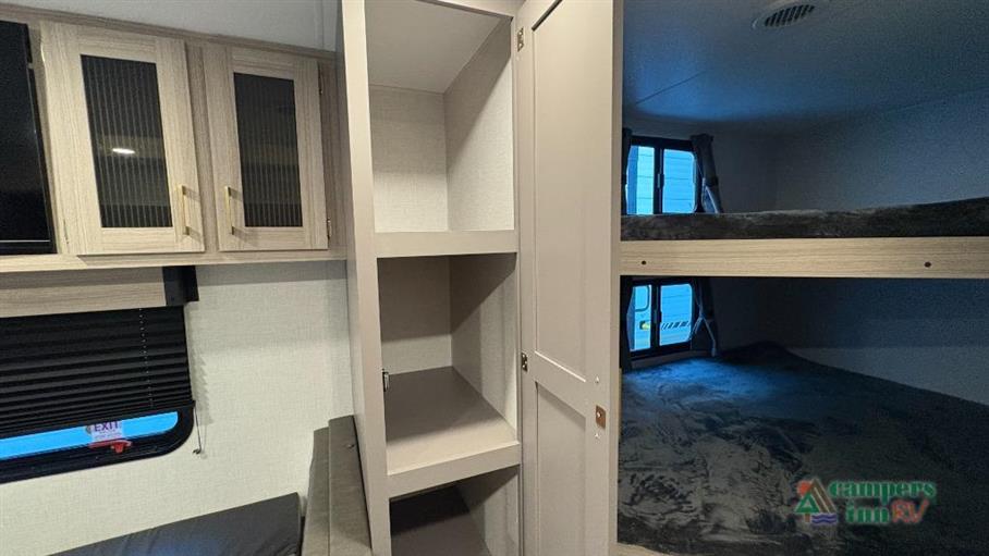 This travel trailer boasts a spacious interior with a single slide-out, giving you extra room to move around and relax. It comfortably sleeps up to 9 people, making it perfect for family trips or camping with friends. The well-designed layout includes a cozy bunkhouse for the kids, a queen-sized bed for the parents, and additional sleeping space in the convertible dinette and sofa. The fully-equipped kitchen comes with a fridge, microwave, and stove, so you can whip up your favorite meals no matter where you are. Plus, the bathroom with a shower ensures you have all the comforts of home.