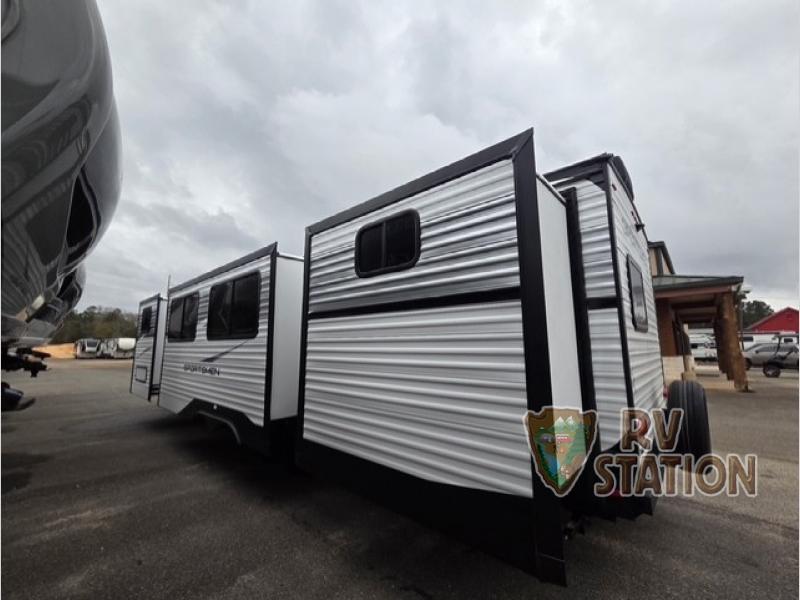 Inside, the Sportsmen SE 333BHKSE can comfortably sleep up to eight people, making it perfect for large families or groups. The intelligently designed floor plan includes a master bedroom, a cozy bunkhouse, and convertible sleeping areas, ensuring everyone has a comfortable place to rest. The interior is thoughtfully equipped with modern amenities, including a fully functional kitchen, a spacious living area, and a well-appointed bathroom, providing all the comforts of home.