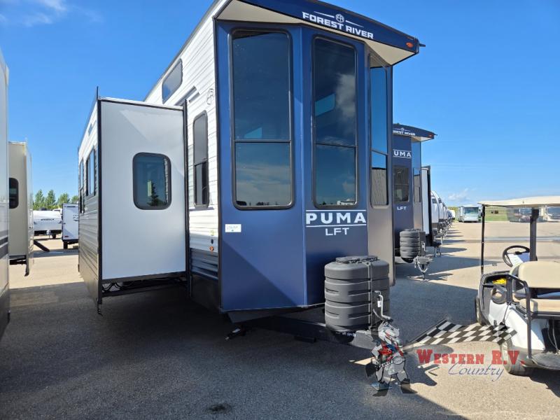 The Puma 402 LFT Park Model also boasts a luxurious master bedroom with a queen-sized bed and ample storage space, ensuring a restful night's sleep. An additional loft area provides extra sleeping quarters, ideal for children or guests. The bathroom is equipped with modern fixtures, including a spacious shower and a vanity with ample counter space. With its combination of style, space, and convenience, the 2026 Palomino Puma 402 LFT Park Model is the perfect choice for those who desire a high-quality, mobile living experience without compromise.