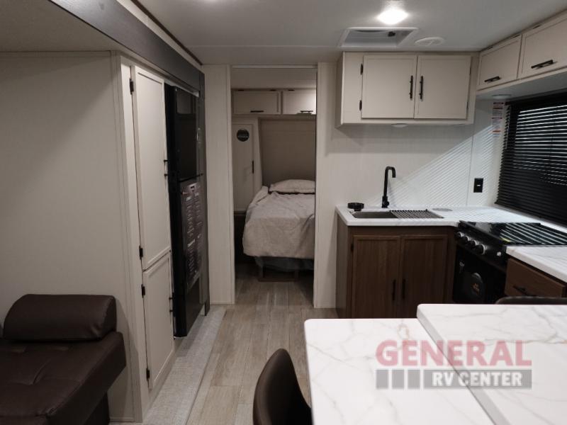 The Avenger 25MKB features one strategically placed slide-out, expanding the living area to create a generous and open environment. This thoughtful design allows for a seamless flow between the kitchen, dining, and living spaces, providing a welcoming atmosphere for relaxation and entertainment. With the capacity to sleep up to seven individuals, this travel trailer is equipped to accommodate family and friends, ensuring everyone enjoys a restful night's sleep. The well-appointed interior includes cozy sleeping arrangements, a fully equipped kitchen, and a stylish bathroom, all crafted with attention to detail and quality materials.