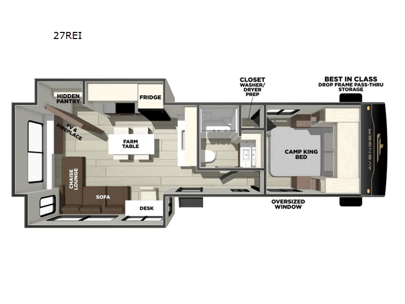 The Avenger 27REI is thoughtfully designed to accommodate up to four individuals, making it an ideal choice for small families or couples seeking adventure without compromising on comfort. The interior layout is optimized for convenience, featuring a well-appointed kitchen, a cozy dining area, and a comfortable living space. The sleeping arrangements are designed to ensure restful nights, with high-quality bedding and ample storage solutions to keep your living space organized and clutter-free.