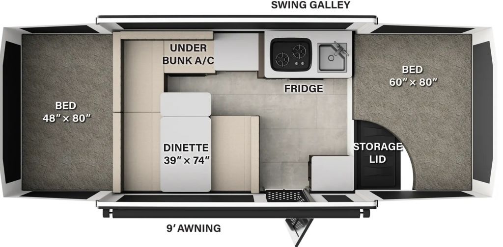 Inside, the Rockwood 1920FT is thoughtfully designed to accommodate up to five sleepers, making it perfect for family trips or a getaway with friends. The spacious interior is equipped with comfortable sleeping arrangements, ensuring everyone gets a restful night's sleep after a day of adventure. The tent trailer's smart layout maximizes space, providing ample room for relaxation and storage, so you can bring along all your essentials without feeling cramped.