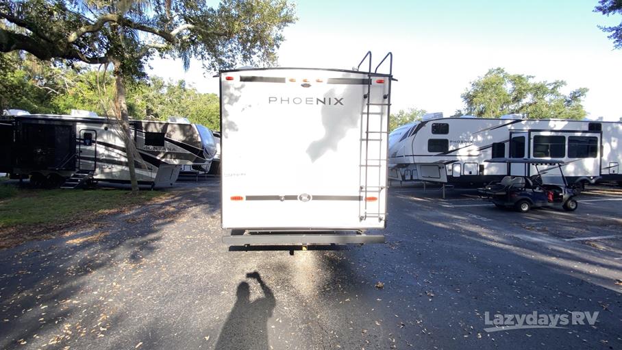 Step inside to find a meticulously designed interior that boasts a generous living space, featuring high-quality furnishings and state-of-the-art amenities. The Phoenix 368TBH offers a unique bunkhouse layout, providing ample sleeping arrangements for up to 10 people, making it perfect for family trips or group adventures. The fully equipped kitchen includes a large refrigerator, a three-burner stove, and a microwave, all complemented by ample storage space, ensuring you have everything you need for gourmet meals on the road. The luxurious master suite, complete with a queen-sized bed and en-suite bathroom, offers a private retreat after a day of exploration.