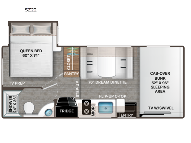 Designed to accommodate up to five people, this RV ensures everyone has a cozy place to rest after a day of exploration. The intelligently designed floor plan maximizes space, offering sleeping arrangements that include a convertible dinette, a cozy overhead bunk, and a comfortable bed. The well-equipped kitchen and bathroom provide all the essentials, ensuring you have everything you need on the road.