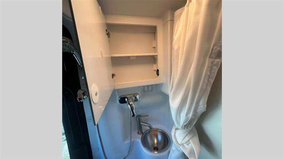 Inside, you'll find a cozy setup that comfortably sleeps three. The smart layout maximizes every centimeter, offering a comfy sleeping area, a functional kitchenette, and a compact bathroom. The kitchen is equipped with all the essentials, including a fridge, a two-burner stove, and a sink, making it easy to whip up your favorite meals on the go. The bathroom features a shower and toilet, ensuring you have all the comforts of home wherever you roam.